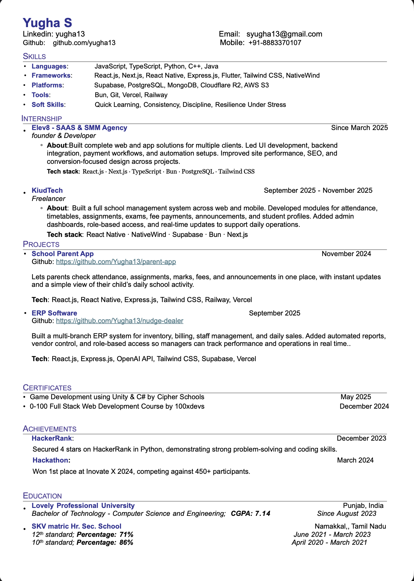 Hello! I'm Yugha's Portfolio Assistant. How can I help you?